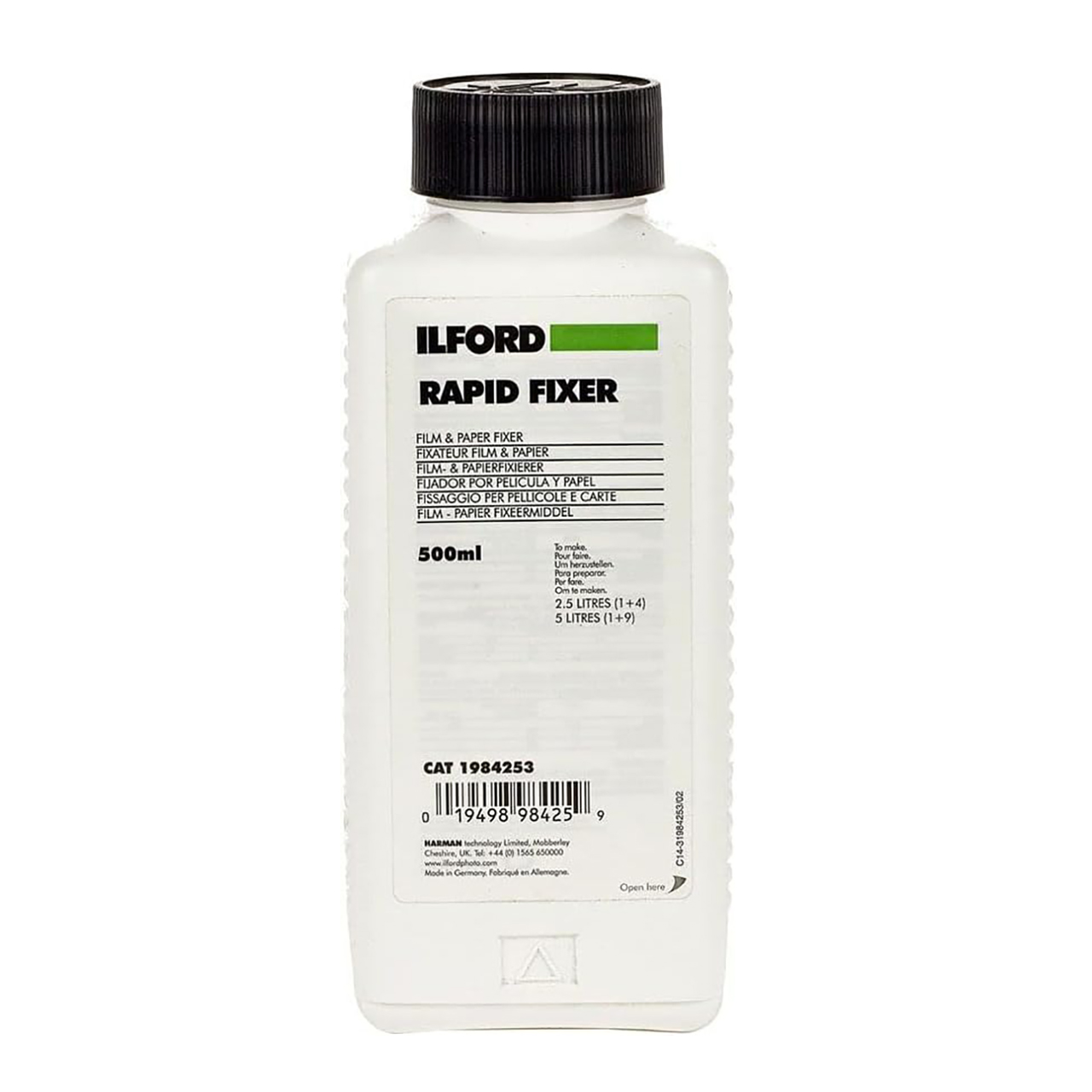 Ilford Rapid Fixer Químico fijador es un fijador rápido que no se endurece y se suministra como un concentrado líquido que se diluye con agua para su uso. Es fácil de usar en el rango de temperatura de 18°C (66°F) para fijar película y papel en blanco y negro en todas las aplicaciones de procesamiento manual y de máquina.
