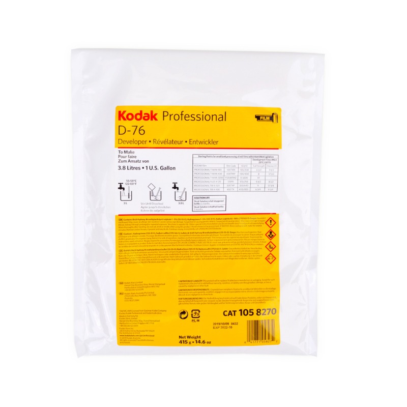 Kodak D-76 es un revelador en polvo de 3,78l, universal para negativos en blanco y negro. El químico revelador de Kodak D-76 ofrece excelente rendimiento superior y ricos detalles de sombras con contraste normal. Se distingue por su grano fino y excelente latitud de exposición. D76 es adecuado para el revelado normal o forzado.