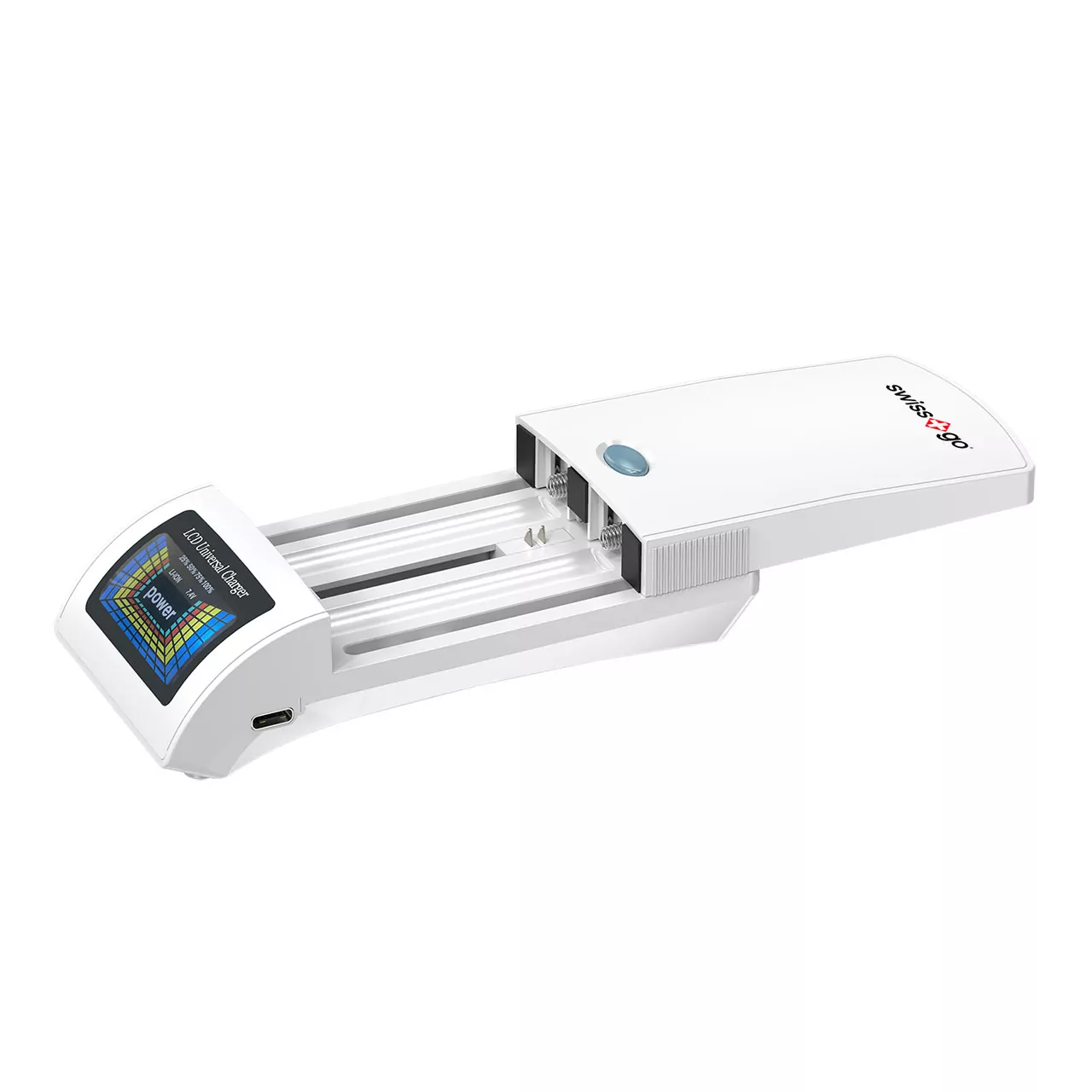 El cargador universal Swiss+go D-760C permite cargar baterías de litio 3,6–7,4 V, pilas AA/AAA/9V y dispositivos mediante puerto USB-C. Con pantalla LCD y detección automática de polaridad y voltaje.